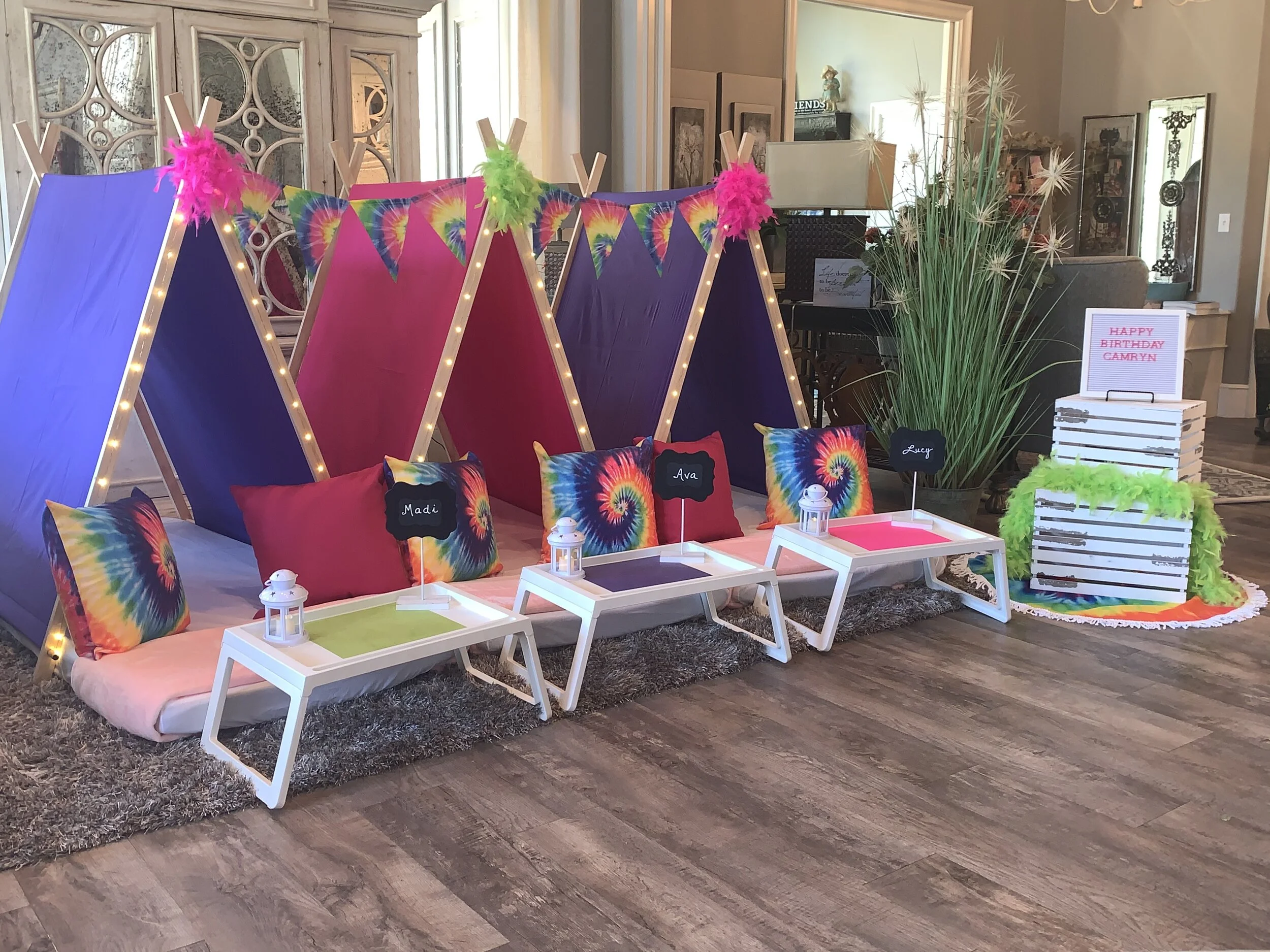 We offer themes for boys and girls. Each package includes tents/teepees, mattresses, cozy sheets and blankets, decorative pillows to match the chosen theme, decorative string lights, activity trays, light up lanterns, personal chalkboards , and various themed décor. Party favors and many other extras are available to add on as well. We want to make your child’s birthday party not only their best, but your easiest one yet!!